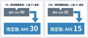 この検査に関する変更はCPAPの話と切り離して考えず、一つの流れとして捉えることが重要です。なぜならCPAP治療適応に数値も変更されたからです。