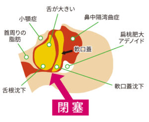 主な原因は、舌や軟口蓋などが喉の奥に落ち込み、空気の通り道である気道を狭くしたり塞いだりしてしまうことです。